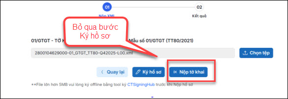 + Trường hợp tờ khai không có Tài liệu đính kèm, chỉ có 2 bước thì bỏ qua bước ký hồ sơ và nhấn Nộp tờ khai