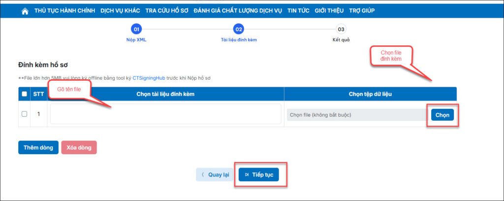 + Trường hợp tờ khai sẽ có thêm bước Tài liệu đính kèm thì cũng bỏ qua bước ký hồ sơ, nhấn Tiếp tục